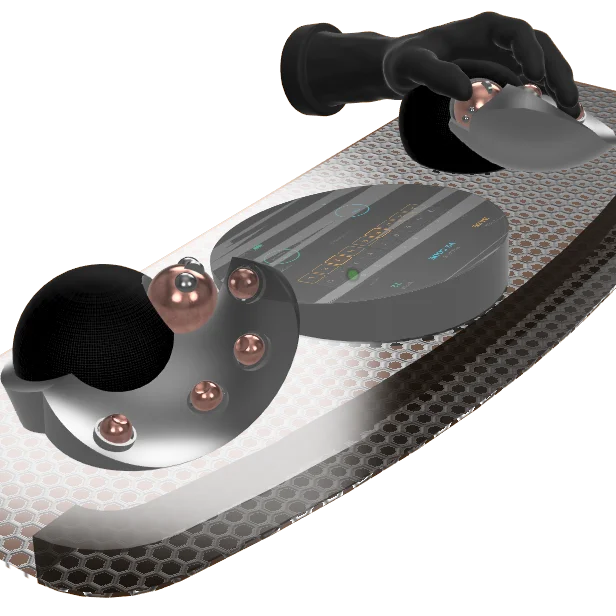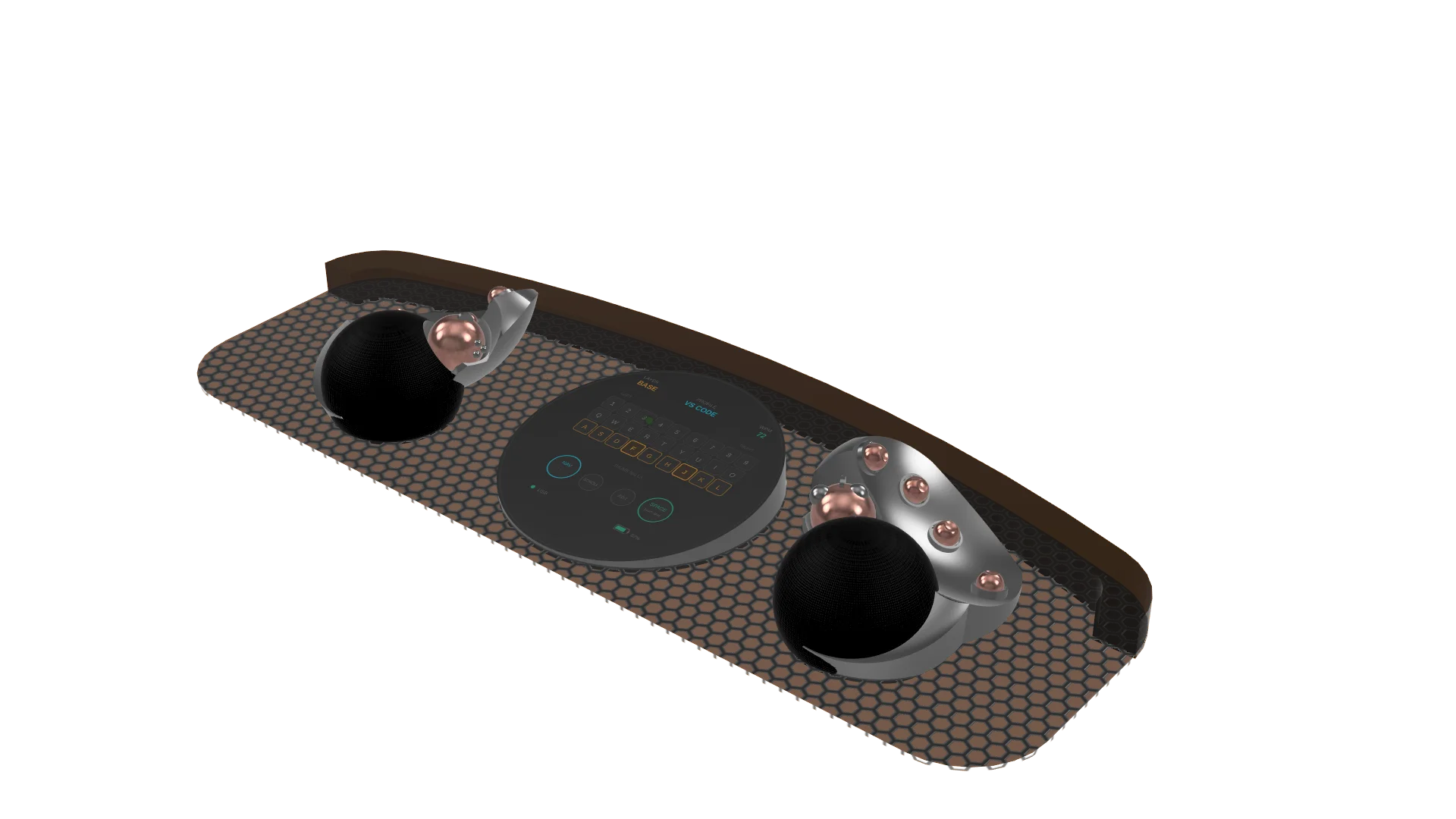 The world's first zero-movement input system. Hands rest on palm mounts. Fingers tilt balls through positions. Thumb controls 6DOF space ball + space key. Open mesh frame, bean-filled leather palm rest. 12 balls total, fully programmable.